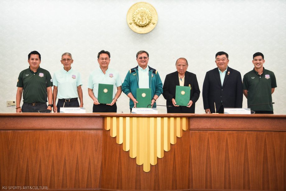 ดร.ดำรงค์ ศรีพระราม รักษาการแทนอธิการบดี มหาวิทยาลัยเกษตรศาสตร์ นายสุวิศว์ เมฆเสรีกุล นายกสมาคมนิสิตเก่ามหาวิทยาลัยเกษตรศาสตร์ในพระบรมราชูปถัมภ์ นายกุลวุฒิ สนาสวัวดิ์ รองประธานสโมสรฟุตบอลเกษตรศาสตร์ เอฟซีและนายจันทร์ธนู สัตยาวัฒนา กรรมการสโมสรฟุตบอลเกษตรศาสตร์ เอฟซี ร่วมลงนามในพิธีลงนามข้อตกลงความร่วมมือ (MOU) โดยมี ผศ.รัชด ชมภูนิช รองอธิการบดีฝ่ายกิจการนิสิตและพัฒนาอย่างยั่งยืน มก.เป็นสักขีพยาน
